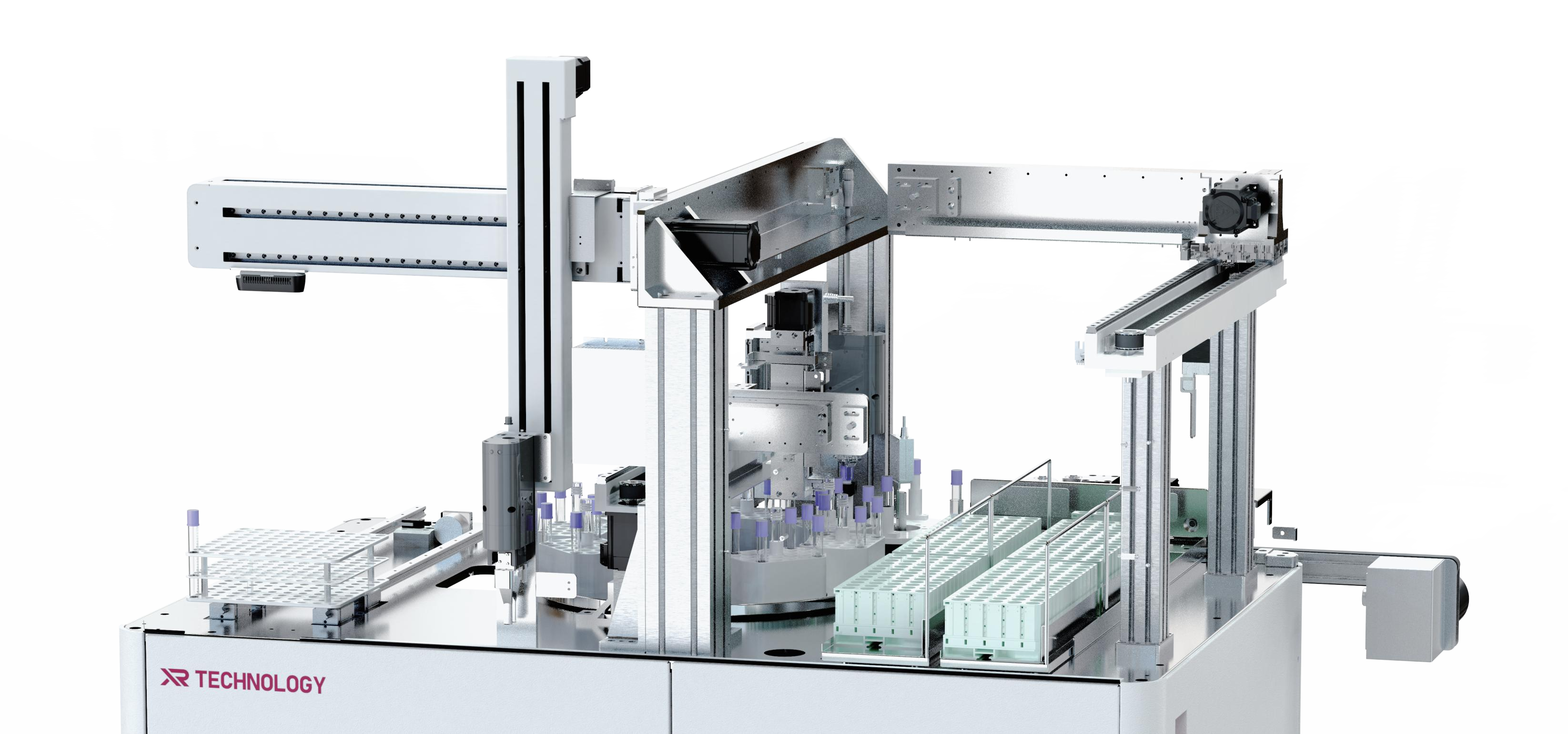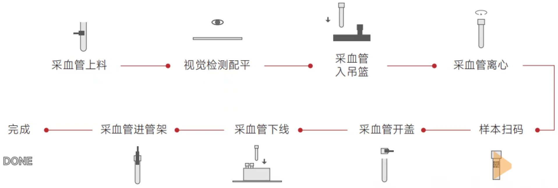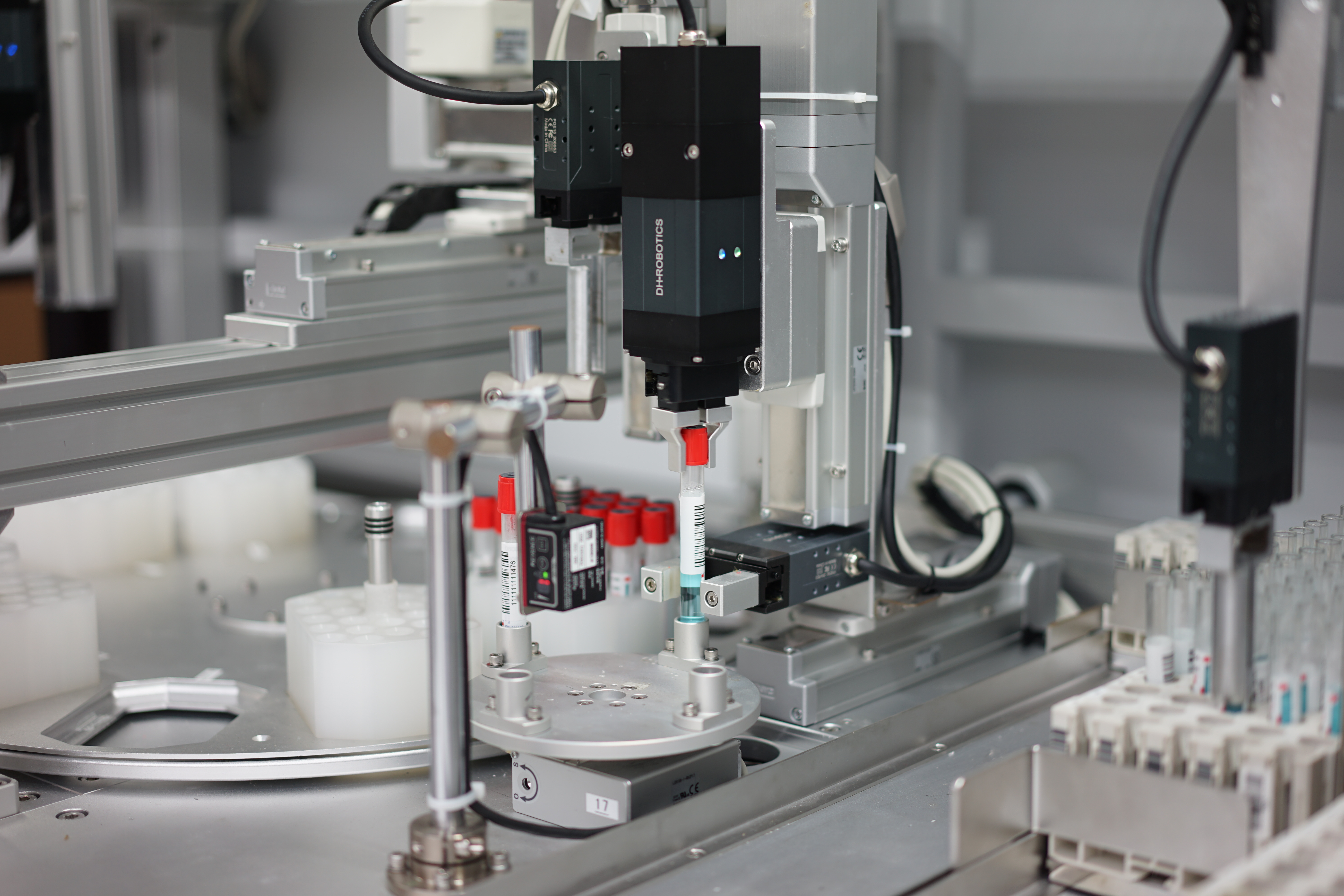 全自动血液样本预处理工作站搭载了搭载柔性机械臂,智能离心机和脱帽机构,运用智能识别相机和相关分析管理 系统,高通量完成采血样本管识别,离心,脱帽操作。