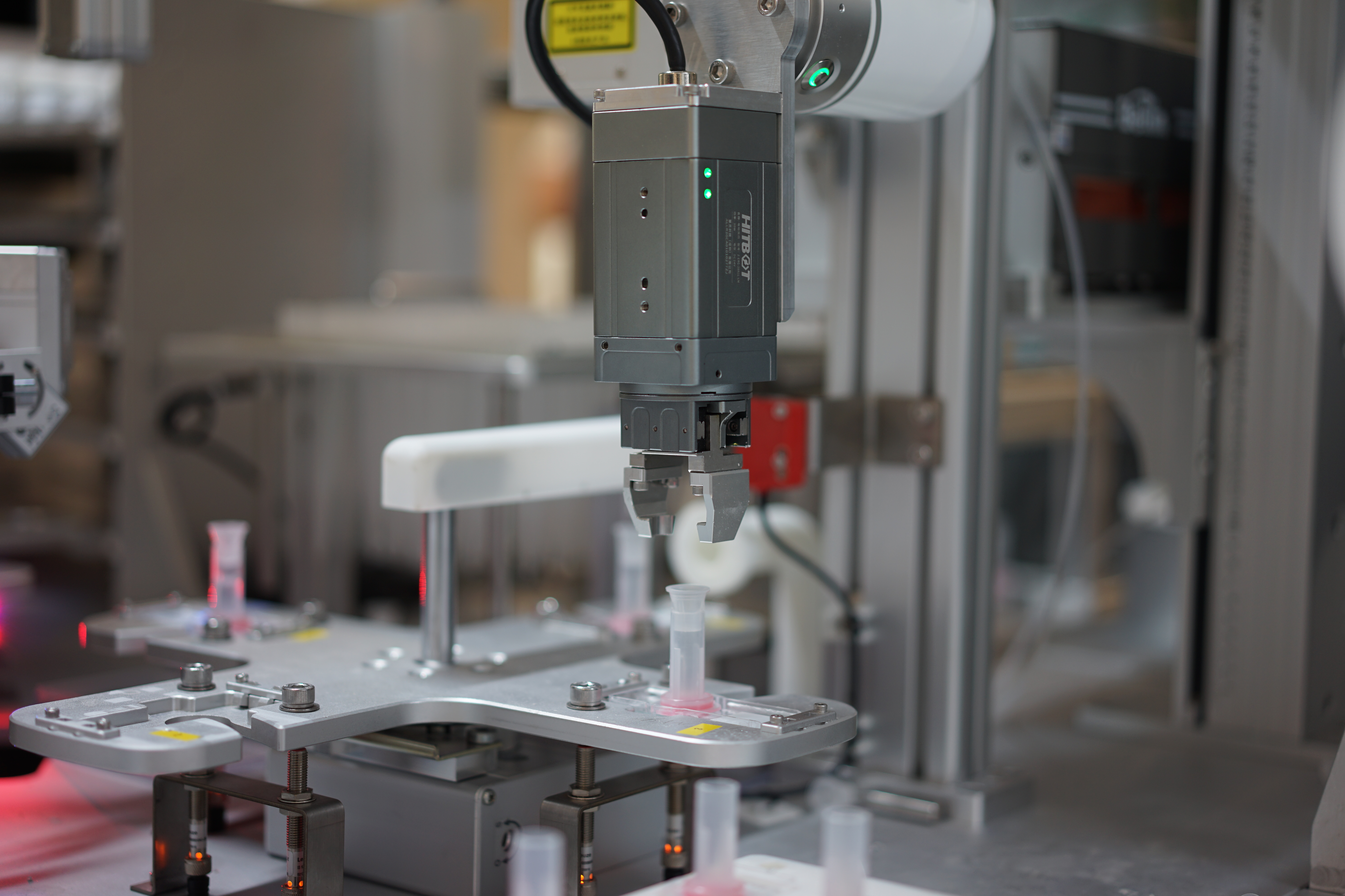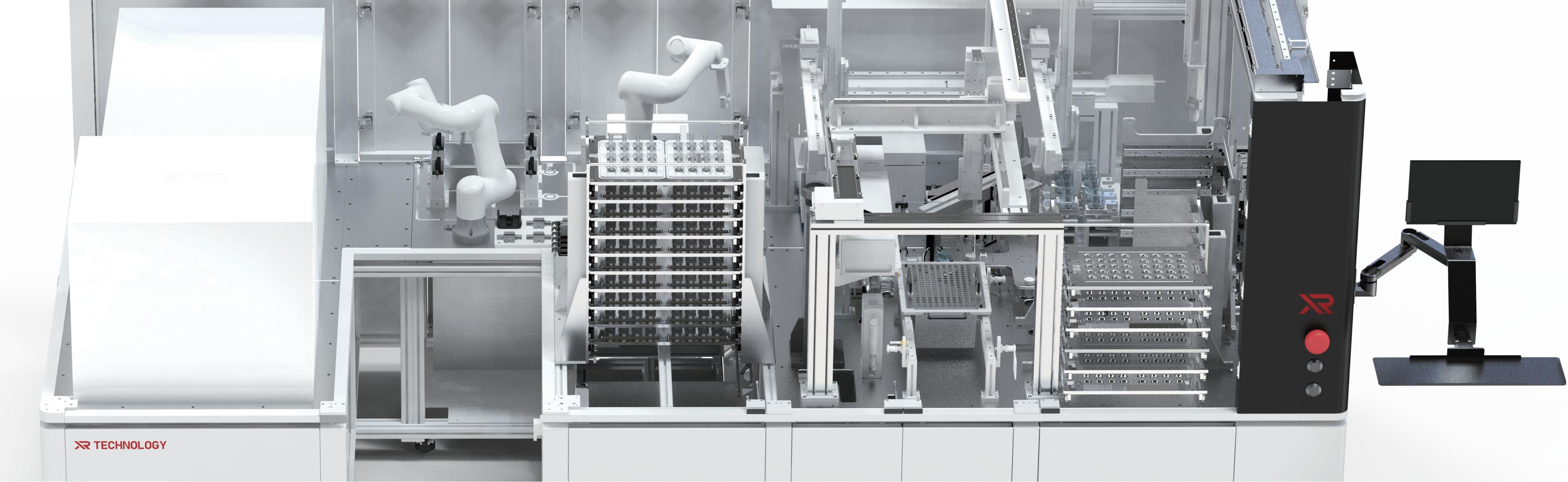 全自动液基细胞样本制备工作站搭载了柔性机械臂, 全自动完成液基细胞样本取样、振荡、离心、染色、 封片等操作,有相应的器皿缓存区域及自动上料机构, 以托盘形式输入、输出物料,便于人工操作。