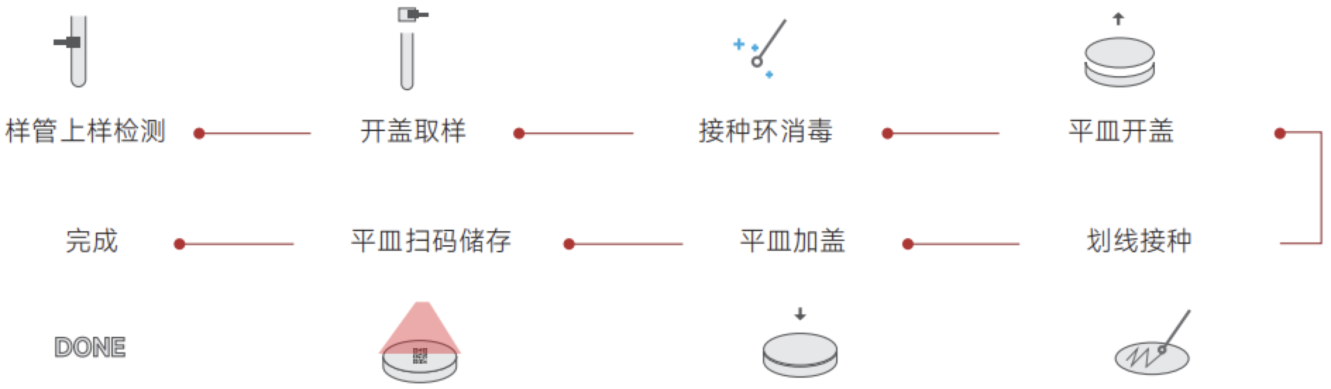 全自动微生物划线接种工作站是一台应用于批量接种平板培养皿的自动化设备,它支持2小时无人值守,取代 繁琐的手工接种,全自动完成平板划线/涂布流程,提供快速、标准化的细菌接种结果。
