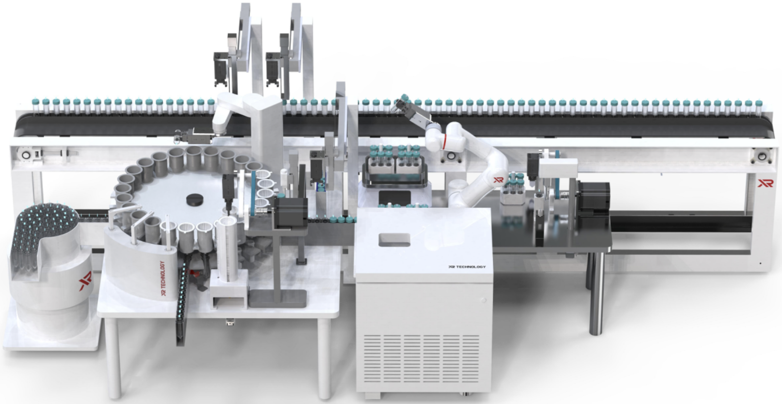 质粒大提包含了接菌培养、集菌裂解、质粒提取等工艺流程,玄刃科技通过分解各个流程的操作 步骤,借助机械臂、传送轨道、离心机、夹爪机构、智能识别相机等设备,全流程实现扫码识别、 开关盖、移液分液、挑菌、离心等操作,最终实现质粒大提全流程自动化。